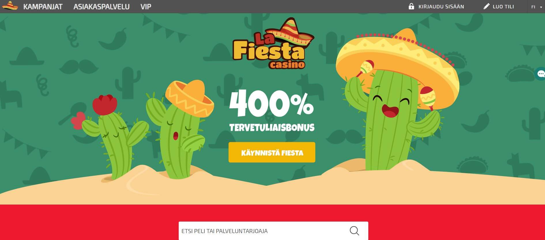 La Fiesta Casino on yllätyksiä täynnä oleva pelipaikka. Sen iloinen teema tuo hymyn jokaisen pelaajan huulille ja mikä parasta tämä hymy tulee pysymään huulilla vielä pitkään. Jos La Fiesta Casinon teema ei innosta, saa tervetuliaisbonuksen kuuleminen viimeistään pelaajien pelijalat vipattamaan. Tällä kasinolla ei nimittäin bonuksissa ole pihtailtu, sillä bonusrahaa on mahdollista kartuttaa 3 000 euron edestä ja ei bonusprosenttikaan hullumpi ole, sillä se on kivunnut ennenkuulumattomaan 400%.
