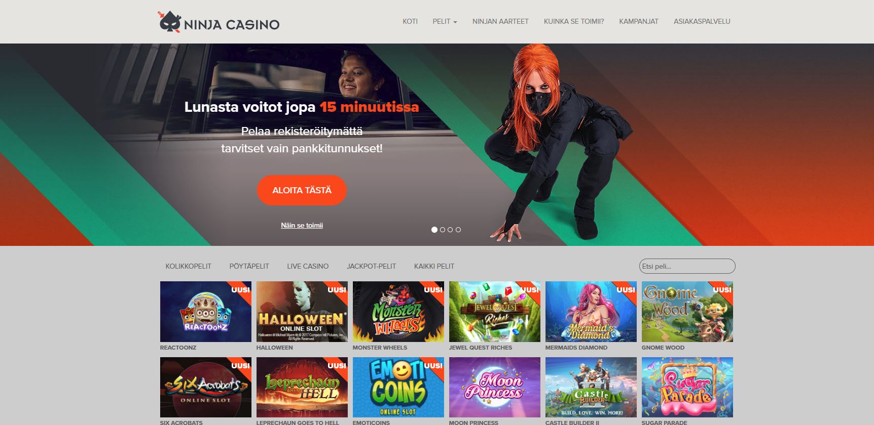Casinoaulaan astuessa pelaajan eten tulee selkeä rivi SuomiVegasin casinotuotteista. Niinkuin aiemmin mainitsimmekin, SuomiVegas tarjoaa kattavan pelivalikoiman, ja kasinon puolelta löytyvätkin slotit, jättipottipelit, pöytäpelit sekä live casino. Suurin osa SuomiVegasin peleistä on NetEntin käsialaa, ja löytyy valikoimasta myös niiden lisäksi Microgamingin sekä Quickspinnin pelejä. Muita pelintarjoajia ovat muun muassa SoftBet, Thunderkick sekä Elk Studios. Live kasinon pelejä tarjoaa NetEntin lisäksi laadukas Evolution, joka striimaa pöytäpelien taikaa huolettomasti ja tuo kasinon aidon tunnelman suoraan pelaajan kotisohvalle. SuomiVegas ei ole mikään suuri netticasino, mutta edellä mainittujen, juurikin pohjoismaalaisten suosimien pelintarjoajien ansiosta pelivalikoimassa riittää laatua ja ennen kaikkea jännitystä.