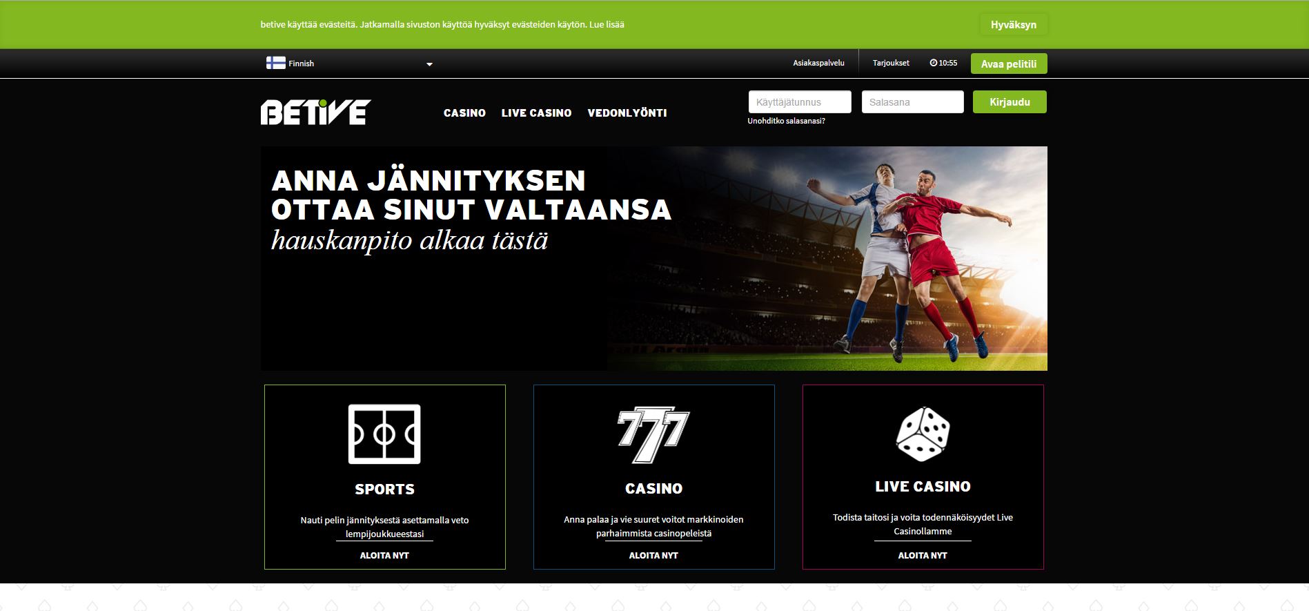 Betive on täysin uusi netticasino, joka miellyttää jokaista sellaista kasinon pelaajaa, joka etsii raikasta sekä modernia mutta luotettavaa pelipaikkaa. Suuntaa Betive kasinolle ja voit olla varma siitä, että hauskuus ei lopu hetkeen! Viihdy satojen kasinopelien ja vedonlyönnin seurassa sivustolla, jolla voit tuntea olevasi kuin kotonasi, sillä tämä nettikasino on kokonaan saatavilla suomen kielellä sivustosta asiakaspalveluun. Liity hauskaan pelaajien joukkoon, johon mahtuu niin kasinopelaamisen aloittelijoita kuin puoliammattilaisiakin. Betiveltä löydät kaiken tarvittavan loistavaan pelikokemukseen netissä.