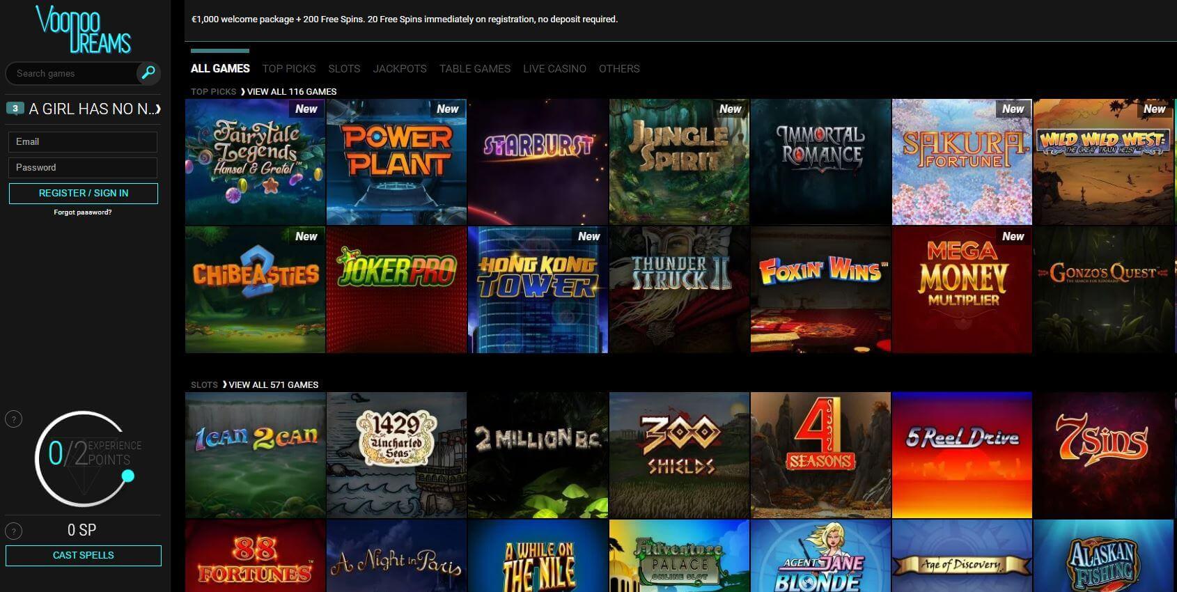 VoodooDreamsin pelivalikoima on monipuolinen ja laadukas, sillä taustalla on alan suosituimmat pelinkehittäjät. Näin ollen pelaaja voi luottaa siihen, että kasinopelit ovat viihdyttäviä ja ennen kaikkea luotettavia. Kasinon pelivalikoimista löytyvät kolikkopelit, jättipottipelit, pöytäpelit sekä live casino. Kolikkopelien joukosta löytyvät kaikki tutut suosikit kuten Starburst, Gonzo’s Quest ja Wild Wild West sekä näiden lisäksi upeita peliuutuuksia kuten Hansel and Gretel. Kasinolla on myös laaja valikoima erilaisia laadukkaita jättipottipelejä, joiden voittosummat ovat päätä huimaavia, jopa miljoonia euroja. Jättipottipelien joukosta löytyvät kaikki huimimmat jättipottipelit kuten Mega Moolah, Mega Moolah Isis sekä Divine Fortune.